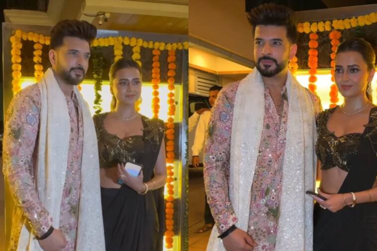 Karan Kundrra and Tejasswi Prakash looked extremely stylish at Ekta Kapoor’s Diwali bash, complimenting each other. Tejasswi Prakash wore a black saree, which she paired with a very fashionable sleeveless black blouse featuring golden-colored work and shoulder detailing. She completed her look with a diamond choker necklace and a bun. Meanwhile, Karan Kundrra wore a light pink embroidered kurta with multicolor work. He layered his kurta with an ivory-colored dupatta that had shiny sequin work.