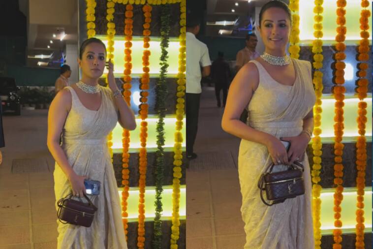 Anita Hassanandani Reddy looked very glamorous and classy. She wore a beautiful cream-colored saree with fine thread and lace work, which she paired with a sleeveless matching blouse. For accessories, she wore a large diamond choker necklace and a matching bracelet. She carried a small burgundy handbag in her hand and styled her hair in a bun, completing her look.
