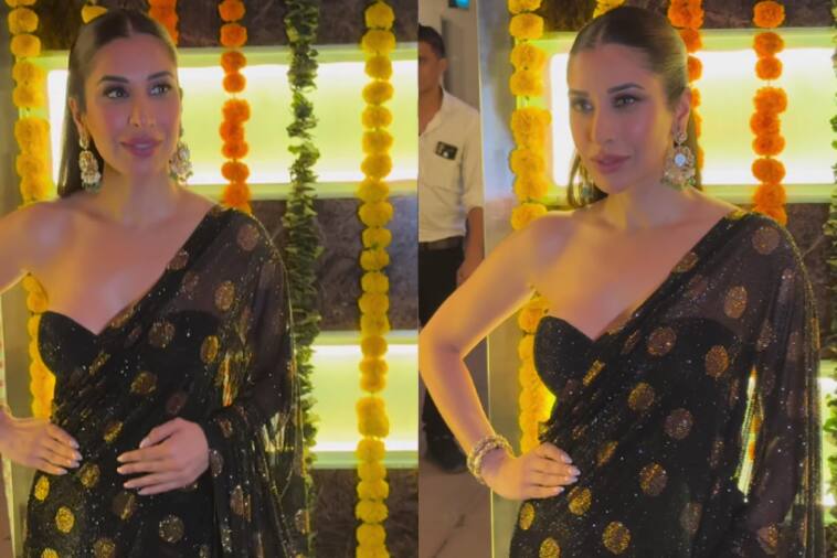 Sofi Chaudhary chose a very glamorous look for Ekta Kapoor’s Diwali celebration. She wore a black shimmer saree with beautiful golden polka dot work. She paired it with an off-shoulder blouse, making her look even more elegant. She tied her hair back and completed the look with large earrings and nude makeup. She managed to blend traditional and contemporary styles perfectly.