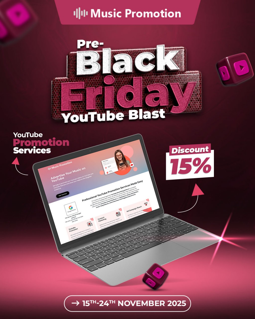 Los Angeles, California Nov 15, 2025 (Issuewire.com) – Music artists on YouTube can leverage the festive season to gain more exposure from global listeners with the help of the Music Promotion Club. This promotional agency specializes in YouTube promotion and is capable of promoting all kinds of music videos on the platform. The company is currently offering a massive discount of 15% on the video promotion services with Pre-Black Friday YouTubeBlast. The sale is starting from November 15 and it will be active till November 24 in order to empower the rising music artists on the platform. Music videos are one of the most important elements for the growth and establishment of a professional music career. This agency is well aware of the fact, and it makes sure to pave a successful way ahead for the artists to make significant progress on their musical journey.