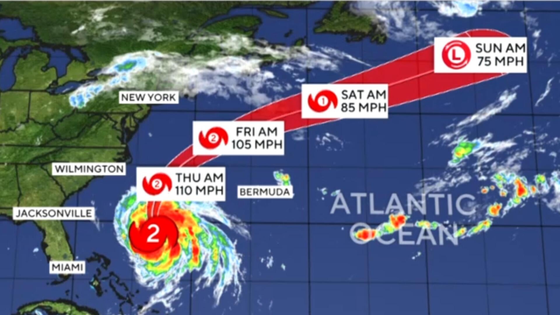 A high-pressure system in the Atlantic was expected to steer Erin away from the U.S. coast while a cold front was also forecast to push the hurricane offshore, CBS News Bay Area meteorologist Jessica Burch reported.
