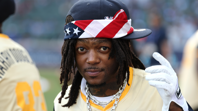 J.I.D. looks on during the 2025 Celebrity Softball Game