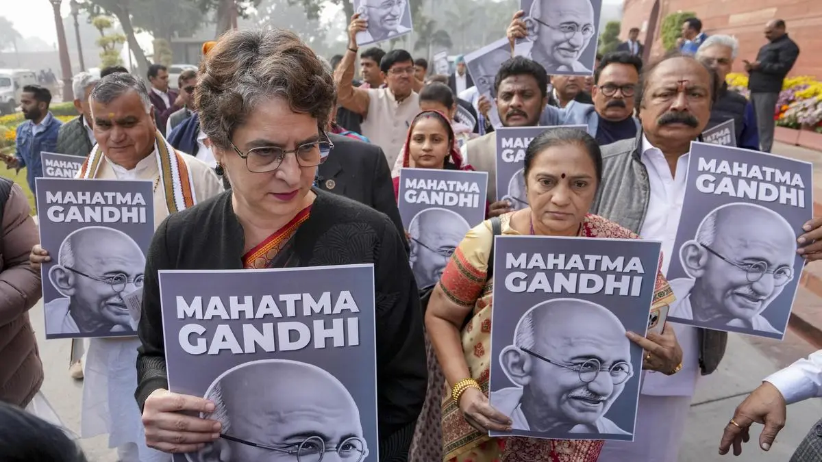 File picture: Congress MP Priyanka Gandhi Vadra, left, along with other leaders during a protest against the Viksit Bharat Guarantee for Rozgar and Ajeevika Mission (Gramin) (VB-G RAM G) Bill that seeks to replace the existing MGNREGA, at the Winter session of Parliament, in New Delhi, Friday, Dec. 19, 2025.