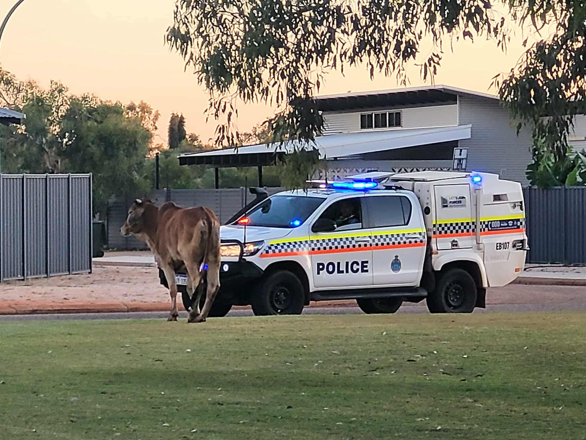 Police and shire rangers were on hand when a cow was spotted roaming in Broome last week. (Supplied)