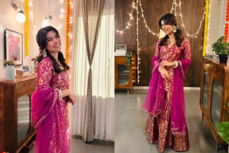 Sonu of Taarak Mehta Ka Ooltah Chashmah, Nidhi Bhanushali, has grown up and now flaunts a stylish look. She looks absolutely gorgeous in this magenta sharara suit with gold embroidery.