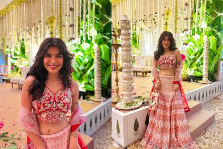 Actress Nidhi Bhanushali looks absolutely ethereal in this lengha with shades of red and white with a beautifully embroidered lehenga. She added subtle makeup and open hair to her look.